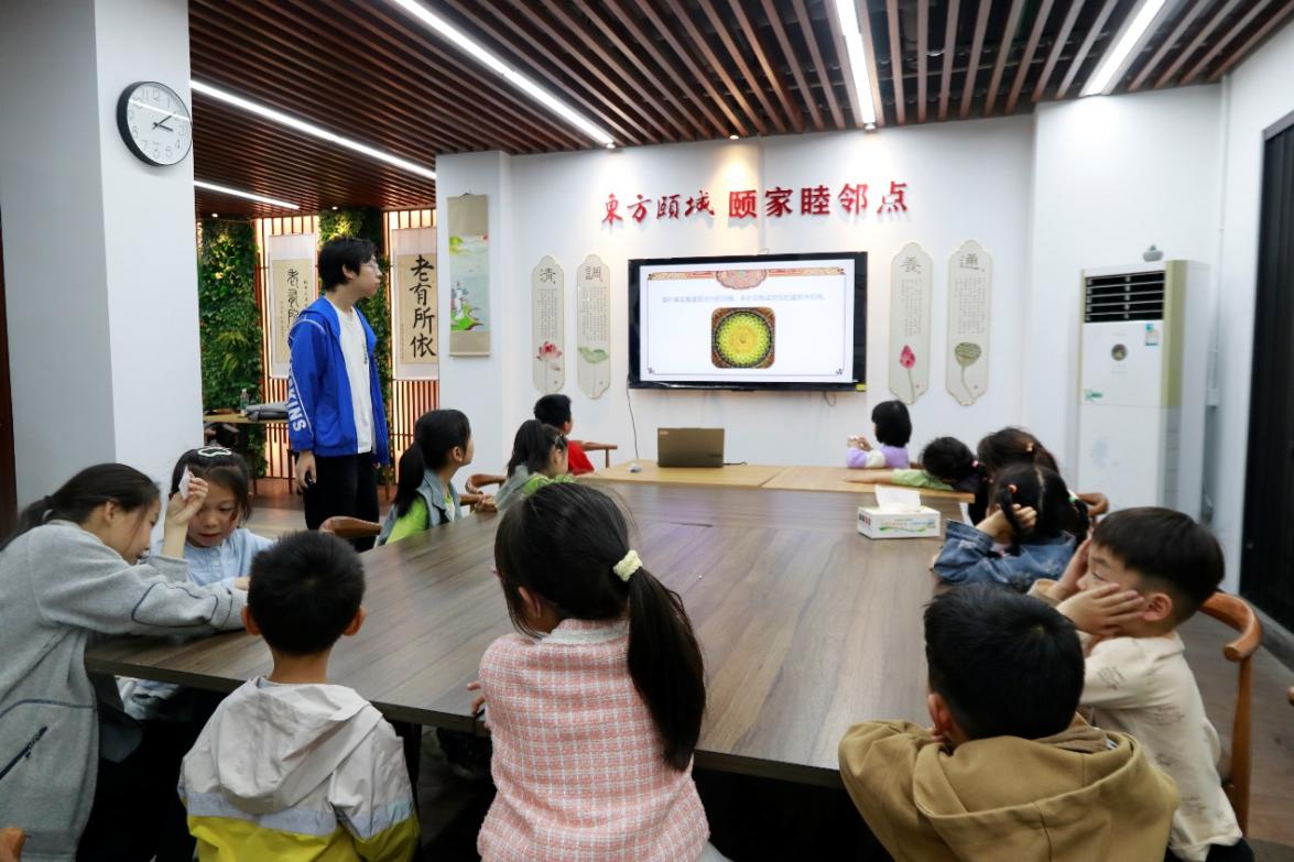 穿越时光脉络,细品文化风华。活动伊始,志愿者为孩子们进行现场讲解与示范。介绍了“藻井”的历史渊源、文化内涵及基本技法,并通过生动的演示视频展示了美学与建筑学相碰撞的繁复技术。孩子们认真聆听,跃跃欲试。通过视频展示和实物讲解,志愿者讲道“就如《梦溪笔谈》中所述的别名‘绮井’‘覆海’一般,当置身于一处古代殿堂,我们抬头仰望藻井,便可看见悠久历史中的气象万千,感受中华美学的理念与韵味。”
