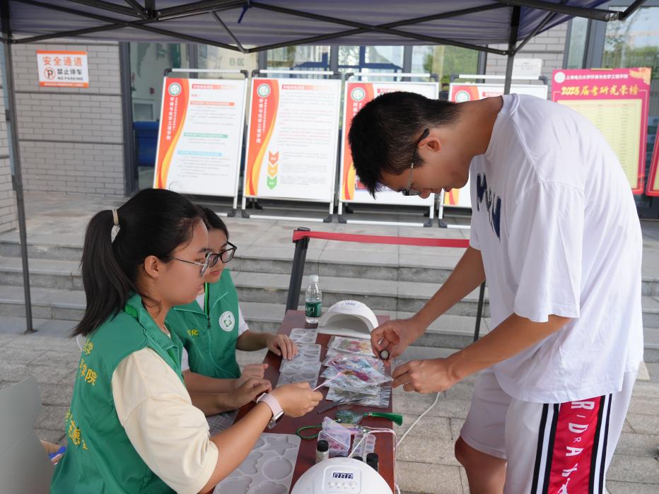 为让新生直观感受专业魅力,学院在迎新区设置了特色互动区。“植物滴胶”摊位前,新生们亲手将缤纷花瓣定格于剔透胶体,感受化学赋予自然的永恒之美;“天气瓶实验”则以其晶体随气象变幻的神奇魔力,引发了阵阵惊叹与浓厚兴趣。这些寓教于乐的互动体验,不仅生动诠释了化学与生活的紧密联结,更在新生踏入环化的第一刻,便成功“相约”他们对科学的无限好奇与探索欲望,为专业学习埋下了兴趣的种子。