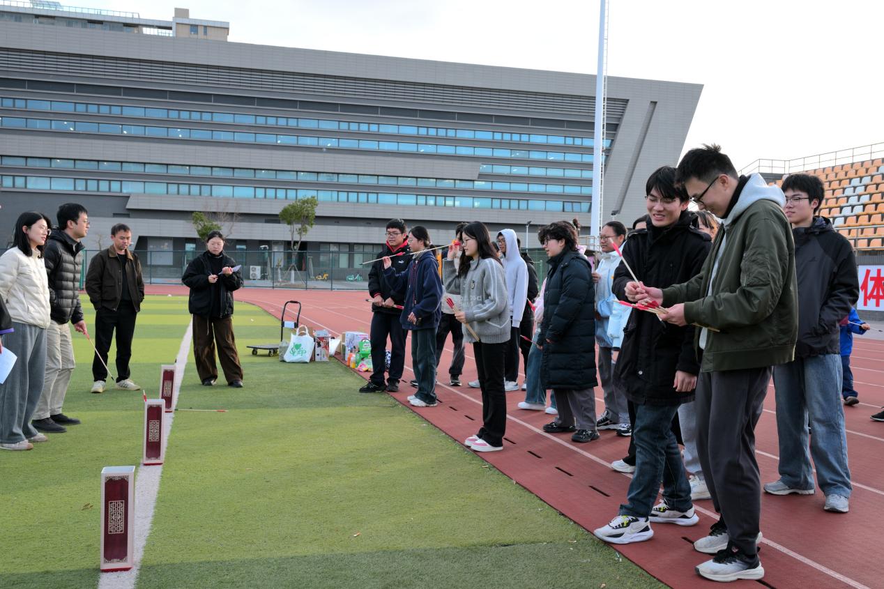 “投壶”项目成为现场解压热门。同学们手持箭矢静立投掷线后,目光聚焦一米外的壶口,屏气凝神抛出箭矢。“咚!”清脆的入壶声引来阵阵赞叹,即便前几箭失利,大家也不急不躁,调整姿势再试一次,命中时的灿烂笑容格外动人。五次投掷机会,每一次出手都是压力的释放,场边“好厉害”“就差一点”的互动声,让氛围愈发轻松欢快。