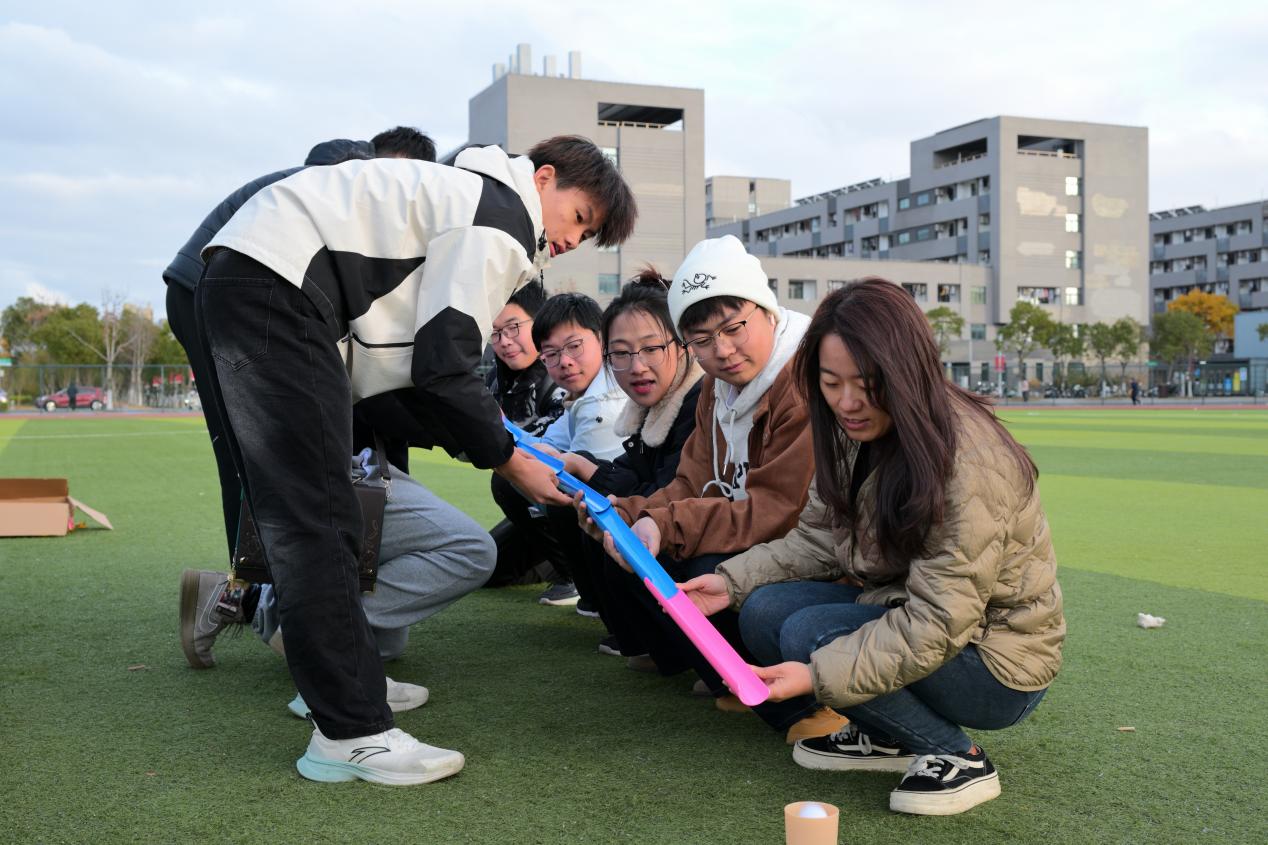 “万里行珠”项目中,队员们手持弧形板快速拼接成“人工轨道”,小心翼翼地引导小球向终点滚动。“稳住,调整角度!”队友间的轻声提醒不绝于耳,目光紧随小球同步移动,呼吸也悄然同频。即便偶有小球跌落,大家也迅速重整旗鼓,在一次次尝试中,每颗成功入杯的小球都成为专注与协作的见证,场上不时响起阵阵欢呼。