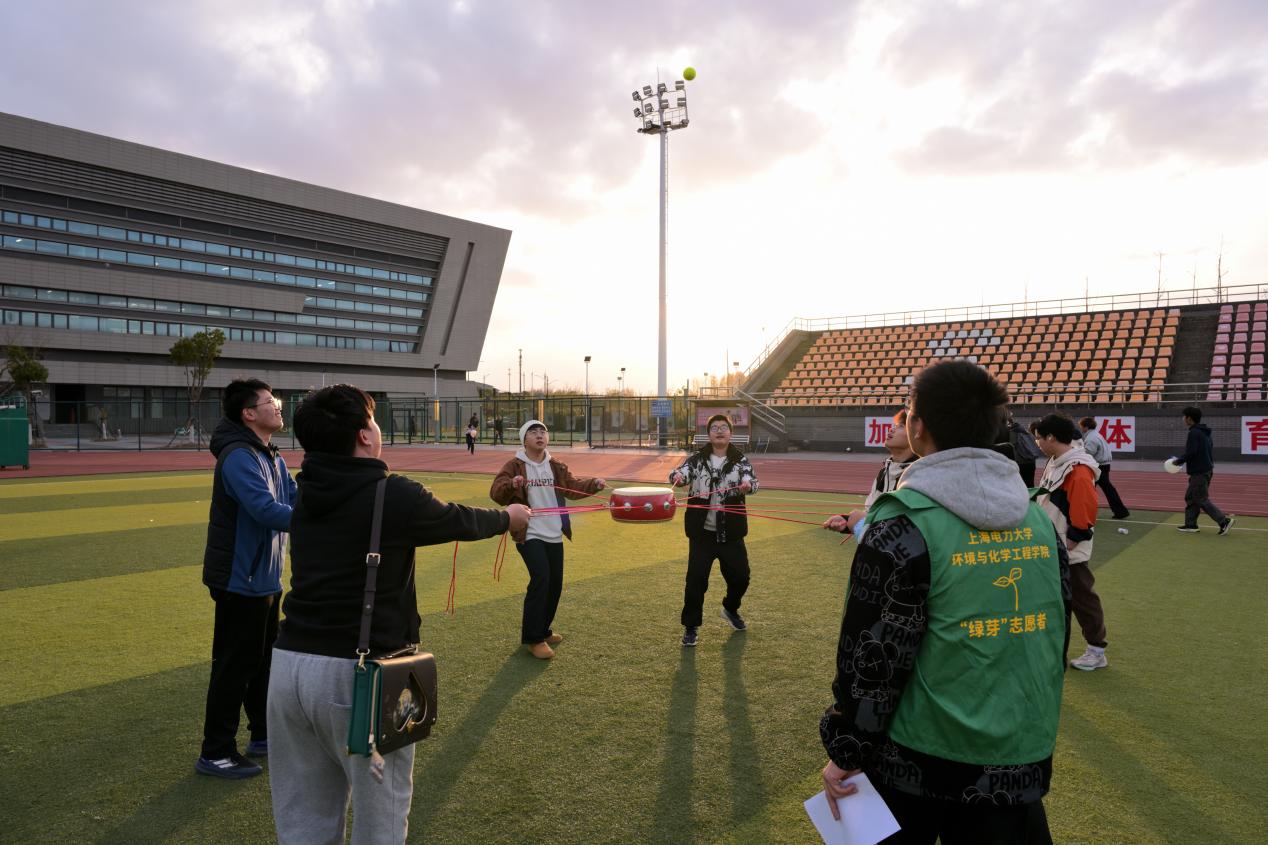 “一、二、三……”“同心鼓”项目中,队员们牵拉绳索协调发力,让网球在鼓面持续弹跳。起初球路不稳、笑声与惊呼交织,渐渐大家找准节奏,齐声计数中网球跳得愈发平稳。有人灵活调整脚步,有人及时校准鼓面,最终有队伍创下99次的击球纪录,在欢呼声中将团队协作推向顶点。