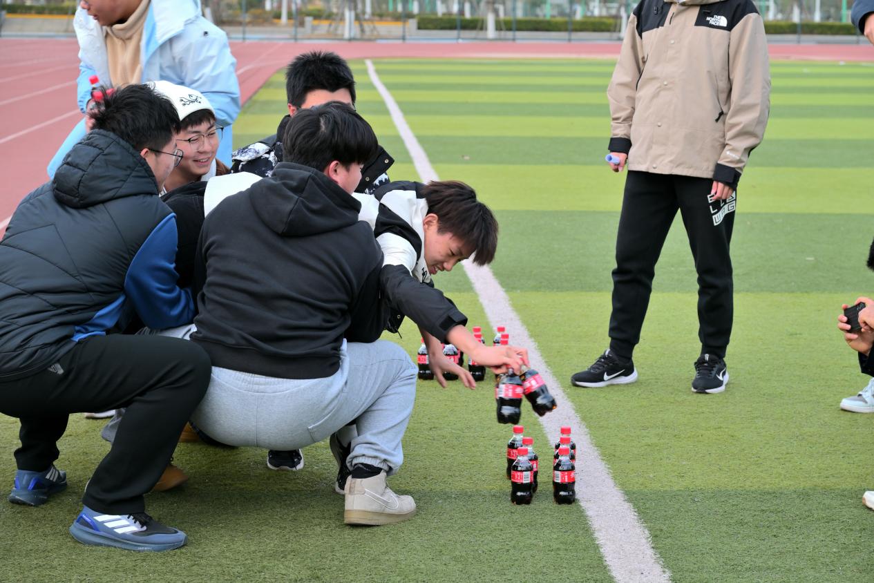 “群龙取水”环节里,各小组围坐商讨策略,取水者身体前倾、双臂伸展,身后队友紧紧扶住其肩腰腿脚,搭起稳固的“人桥”。从近距离轻松取水到挑战远距离悬空抓取,大家在信任与支撑中不断突破,每一瓶成功取回的饮料,都凝聚着团队的默契与力量,胜利的欢呼此起彼伏。