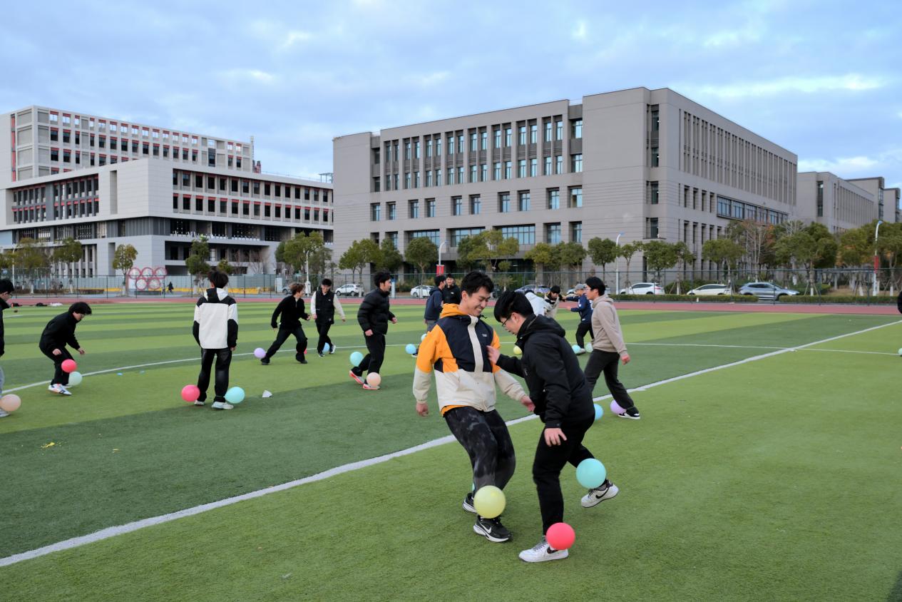 活动尾声的“气球保卫战”将氛围推向高潮。师生们领取代表不同“压力源”的彩色气球,吹气、系绳,完成一场特殊的“压力上膛”仪式。哨声响起,田径场化作欢乐的“减压战场”:大家灵活穿梭,既要守护脚踝上的气球,又要机敏出击;有人结伴协作、背靠背形成守护圈,有人迅捷出击、连续击破。气球爆破的“砰砰”声此起彼伏,与奔跑声、欢笑声交织成活力满满的秋日乐章。随着活动区域逐步“缩圈”,剩余参与者展开最终角逐,紧张中满是纯粹的快乐。夕阳下,散落的气球碎片宛如星点,为这场心灵之旅画上圆满句号。