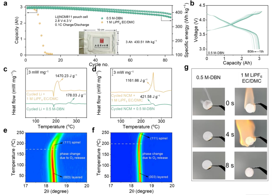 实验数据充分验证了该策略的卓越性能。基于此电解液组装的Li||NCM811全电池,在极具挑战的4.5 V高截止电压下,可稳定循环600圈,容量保持率高达90.19%,且在60 °C高温极端条件下依然保持81.18%的容量,展现了良好的热稳定性和长循环寿命。采用该技术的软包电池实现了430.51 Wh kg-1的超高能量密度,这一指标在目前报道的采用不可燃电解液的锂金属电池中处于领先地位,为产业化应用奠定了坚实基础。