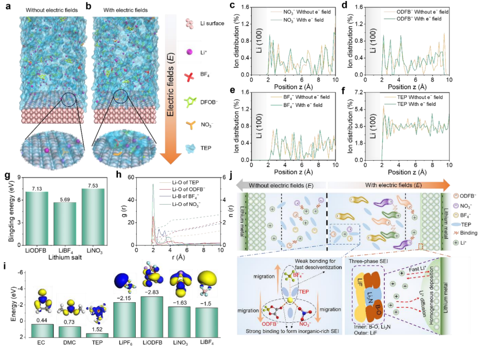 面对这一挑战,公司研究团队设计了一种以磷酸三乙酯(TEP)为单一溶剂的本征不可燃电解液体系,并引入多种锂盐进行精准调控。研究的亮点在于“电场调控阴离子运动方向”这一核心机制。团队敏锐地捕捉到不同阴离子与锂离子结合能的差异,利用外加电场的导向作用,指挥阴离子在电极表面“各就各位”,从而构筑出具有明确功能分区的“三相”固态电解质界面(SEI):内层“守门员”(富含Li3N)——由强结合力的ODFB-和NO3-阴离子在电场驱动下优先分解形成,不仅提供了极高的离子电导率,更显著降低了界面阻抗,确保离子快速、均匀通过;中层“缓冲垫”(B-O玻璃态)——作为低结晶度的过渡层,它赋予了SEI膜优异的机械柔韧性和形变自修复能力,有效抑制了锂枝晶的刺穿;外层“装甲层”(富含LiF)——由弱结合力的BF4-阴离子在外层形成,提供了极高的硬度和化学稳定性,像一层坚不可摧的铠甲,抵御高电压正极的氧化侵蚀。这种“内柔外刚、导离子与阻电子”协同作用的智能界面,完美解决了传统SEI膜“一损俱损”的结构缺陷。