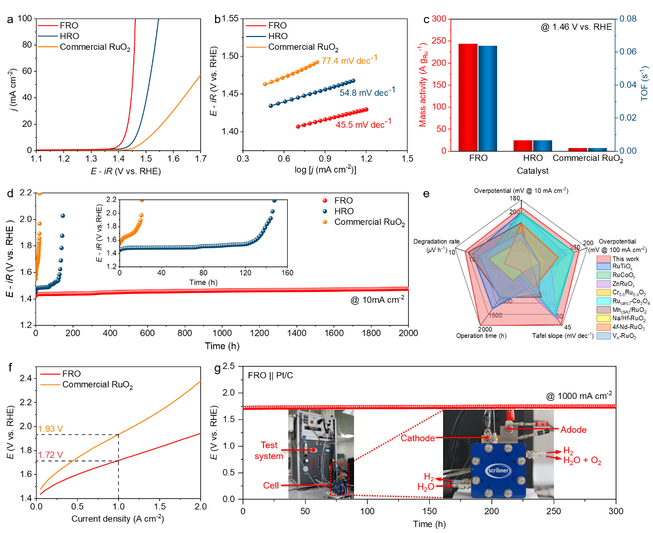 得益于这一独创设计,所制备的催化剂表现出卓越的综合性能:达到10 mA cm-2的电流密度仅需191 mV过电位,并稳定运行超过2000小时。该催化剂组装的实际电解槽在低至1.72 V的电压下即可获得1000 mA cm-2的高电流密度,并稳定运行300小时以上,电压衰减速率仅为每小时84μV。