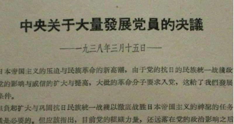 中共中央发出《关于大量发展党员的决议》,指出:“为了担负起扩大与巩固抗日民族统一战线以彻底战胜日本帝国主义的神圣的任务,强大的党的组织是必要的。”为此,大量的发展党员,是党目前迫切与严重的任务。要打破在发展党员中的关门主义倾向,也要防止“拉伕式的办法”;对新党员应注意以初步的马克思列宁主义和党的建设教育,使他们了解共产主义的基本理论。