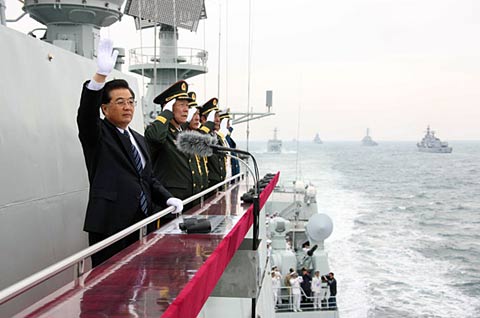 2009年4月23日 胡锦涛在山东青岛出席庆祝人民海军成立60周年海上阅兵活动。次日,胡锦涛在会见海军老同志和英模代表时强调,大力弘扬我军优良传统,全面推进海军现代化建设。