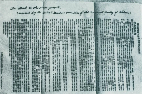 中共中央发表《告全国民众》,号召全国人民奋起,同帝国主义的暴行作斗争。