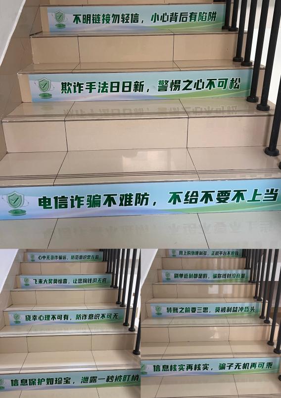 公司积极营造浓厚的反诈宣传氛围,力求做到“抬头可见、驻足即学”。在学院楼门前的主干道上,悬挂着醒目的反诈标语横幅,“未知链接不点击、陌生来电不轻信、个人信息不透露、转账汇款多核实” 等朗朗上口的提示语,时刻提醒着过往员工提高警惕。同时,学院创新性地在楼内楼梯台阶张贴 “防诈阶梯”警示地贴,诸如“信息核实再核实,骗子无机再可乘”“侥幸心理不可有,防诈意识不可无” 等标语,让员工在日常行走间潜移默化地接受反诈教育。此外,学院充分利用新媒体平台的传播优势,在微信公众号上连续推出《诈骗套路多 防诈有妙招》专题内容,各班级群也定期转发警方发布的预警信息,确保反诈宣传全方位、无死角,真正深入到员工的学习与生活之中。